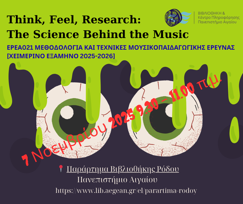 Στο πλαίσιο του μαθήματος ΕΡΕΑ021 – Μεθοδολογία και Τεχνικές Μουσικοπαιδαγωγικής Έρευνας (Χειμερινό Εξάμηνο 2025–2026) και σε συνεργασία με τη Βιβλιοθήκη και το Κέντρο Πληροφόρησης του Πανεπιστημίου Αιγαίου, συνδιοργανώνεται το εργαστηριακό ερευνητικό σεμινάριο με τίτλο «Think, Feel, Research: The Science Behind the Music» με την επιστημονική ευθύνη της διδάσκουσας Δρ. Μαρίας Αργυρίου.
